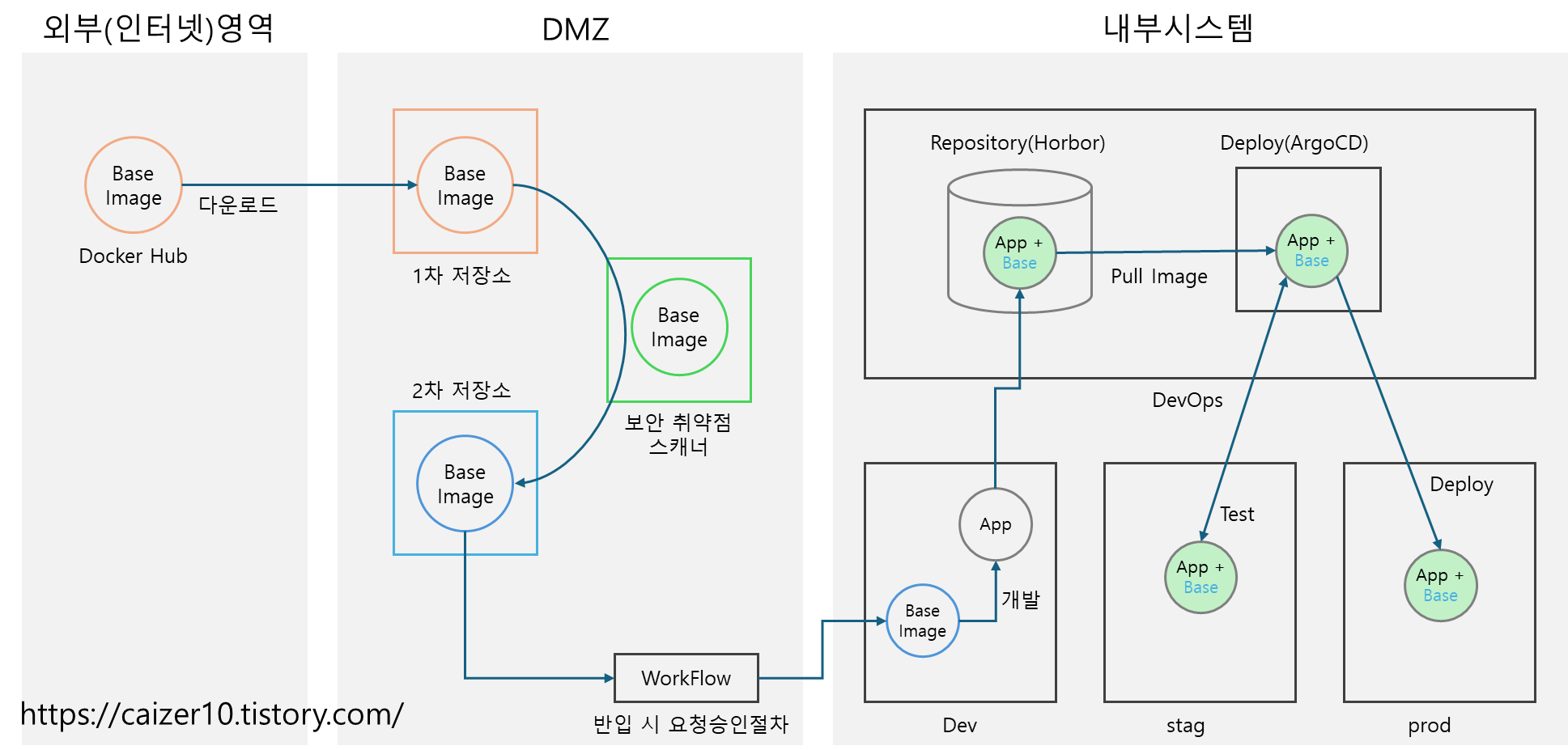 - Workflow 통해 보안 승인 절차 진행: 이미지는 승인 절차를 거친 후 내부 개발망에서 사용될 수 있습니다. 개발된 애플리케이션과 Base Image가 결합된 이미지는 최종적으로 Harbor 레포지토리에 저장됩니다.