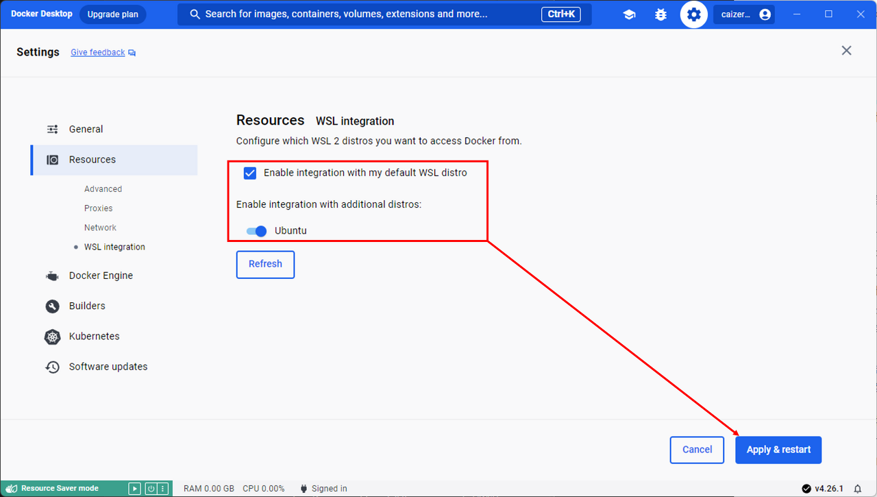 3. "WSL Integration" 탭으로 이동하고 사용하려는 WSL 2용 리눅스 배포판을 선택하고, 해당 배포판에서 Docker 컨테이너를 사용할 수 있도록 설정합니다.