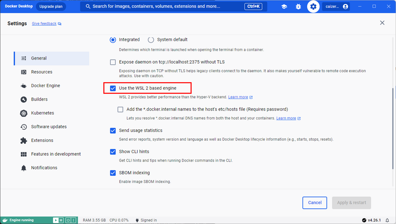 2. "General" 탭에서 "Use the WSL 2 based engine" 옵션을 선택합니다.