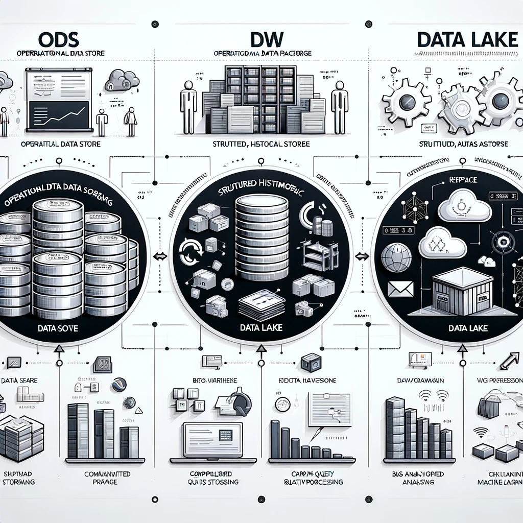 ODS, DW, Data Lake 비교 가. ODS (Operational Data Store) 1. 목적 ODS는 실시간 또는 거의 실시간으로 데이터를 처리하고 분석하는 것을 목표로 합니다. 이는 기업이 현재 상황에 대한 빠른 통찰력을 얻고 신속하게 의사결정을 내릴 수 있도록 지원합니다. 2. 데이터 유형 ODS는 주로 최신의 운영 데이터에 중점을 두며, 이러한 데이터는 짧은 시간 동안만 저장되고 자주 업데이트됩니다. 이는 변화하는 비즈니스 요구사항에 신속하게 대응하기 위함입니다. 3. 사용 사례 일일 운영 보고, 실시간 성능 모니터링, 고객 서비스 관리와 같은 실시간 비즈니스 프로세스에 주로 사용됩니다. 4. 특징 ODS는 빈번한 업데이트와 신속한 데이터 접근을 가능하게 하여, 실시간으로 변경되는 데..